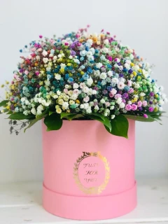 Композиция из разноцветной гипсофилы, словно радуга воплощенная в цветах, призвана принести яркость и радость в серые будни. Нежные, как облака, цветы гипсофилы создают атмосферу легкости и воздушности, напоминая о веселых днях детства. Каждый цветок, будто луч солнца, пронизывает сердце своим теплом и светом. Разноцветные оттенки гипсофилы переливаются друг в друга, создавая уникальное сочетание цветов, которое словно танец радуги на небесах. Шляпная коробка подчеркивает нежность этой композиции.